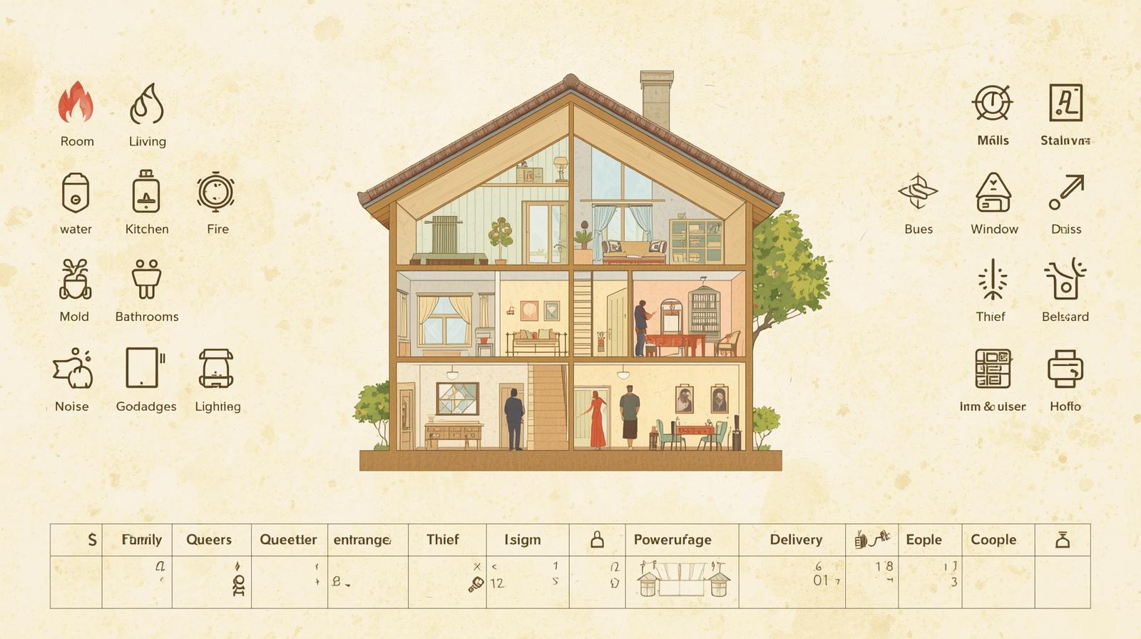| 방/거실/부엌/욕실/문·창/계단 | 2편 | 기능·경계·교류. 결말이 환기/채광/정돈이면 길. |