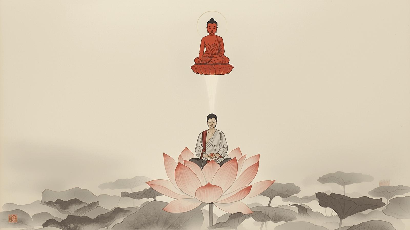 - 정수리 위 아미타불 관상: 연꽃 좌대 위 붉은 광명의 아미타불을 관상합니다. 아미타불 심장에서 흰빛의 관로가 내려와 내 정수리와 연결됩니다.