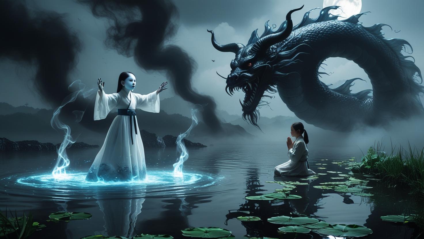 악신은 연못 안에서 다시 제물을 요구하며 마을 사람들을 유혹했다.