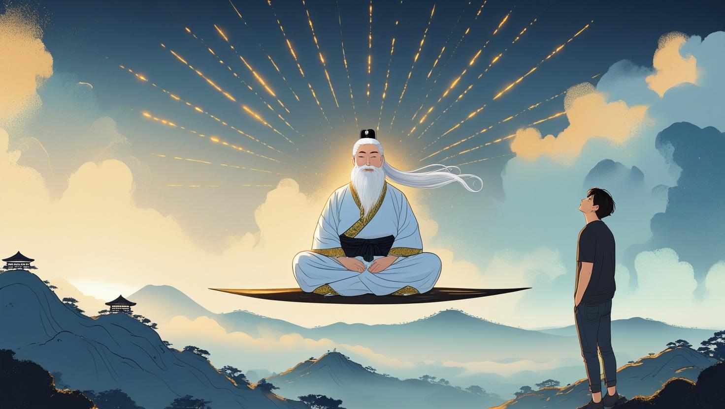 정상 근처에 도착하자, 거기엔 정말 믿기 힘든 광경이 펼쳐져 있었습니다. 한 할아버지가 공중에서 가부좌를 틀고 앉아 있었고, 온몸에서는 눈부신 빛이 사방으로 뻗어 나가고 있었어요. 그 빛은 영화 속에서 우주선이 광속으로 달릴 때 창밖으로 보이는 직선 형태의 빛줄기와 비슷했죠.