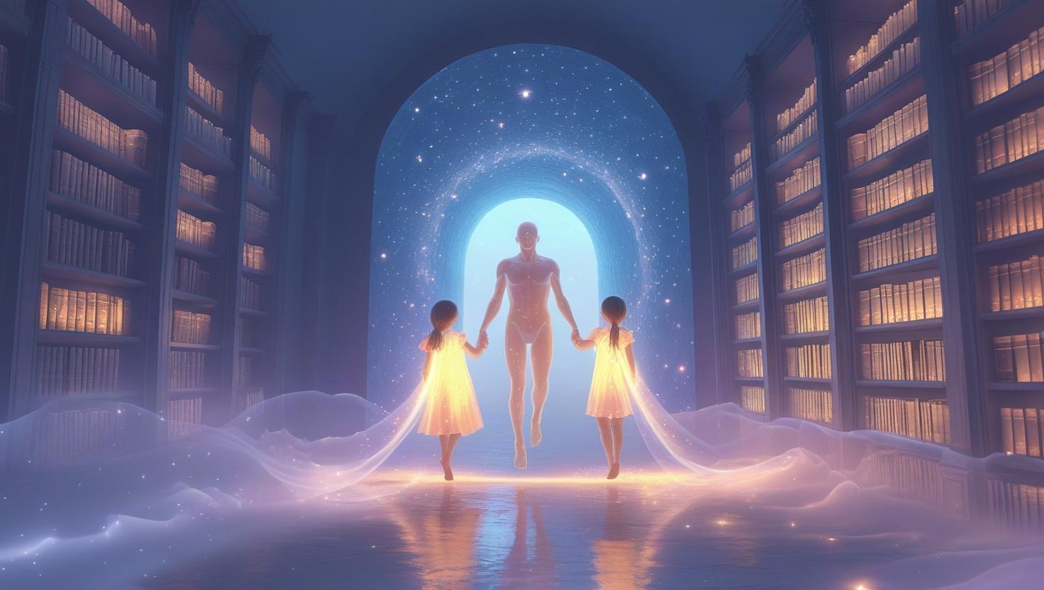 이동 경로는 터널과 공중에 떠 있는 계단 같았고, 그 끝에는 끝없이 펼쳐진 공간과 거대한 책장이 있었습니다. 책장에는 가늠할 수 없을 만큼 많은 책이 꽂혀 있었고, 아이들은 그중 몇 권을 제게 건네주었습니다. 책 속에는 천서처럼 정리된 지식이 가득했으며, 그 순간 내용이 직관적으로 제 안으로 전달되었습니다. 하지만 아이들은 “이 기억은 특정 상황이 올 때까지 봉인될 것”이라고 말했습니다.